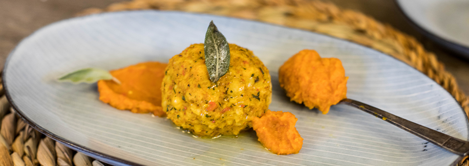 Die Semmelwürfel in eine große Schüssel geben. Ländle Milch mit Brühwürfel erwärmen und über die Semmelwürfel gießen. Alle restlichen Zutaten inkl. dem Kürbispüree untermischen und alles sehr gut vermengen. Falls die Masse zu feucht ist, einfach etwas Mehl zufügen.